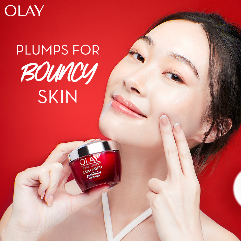 Plump & Bouncy Skin all day long. Olay’s Unique technology Collagen Peptide 24 penetrates^ better into the skin. Regular collagen have larger molecules that couldn’t penetrate into the skin. Olay’s Collagen Peptide is a smaller molecule, hence it penetrates^ better into the skin.
